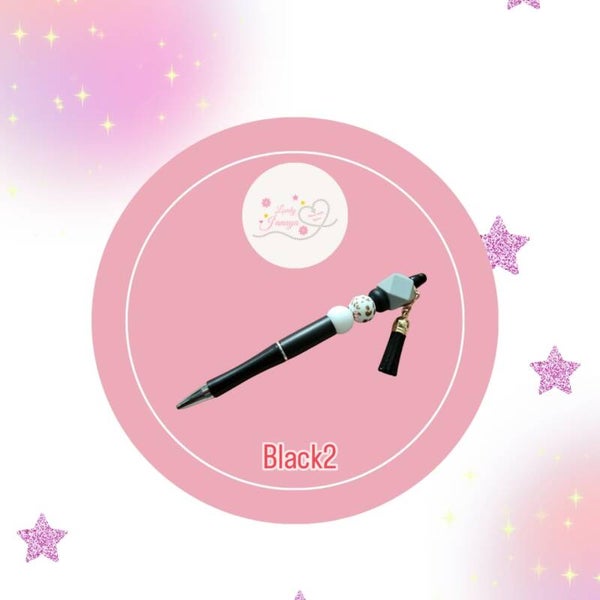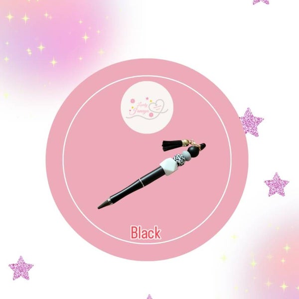 Plastic kralenpen met 4 kleurrijke kralen, kwastje en een kreeftensluitingen.