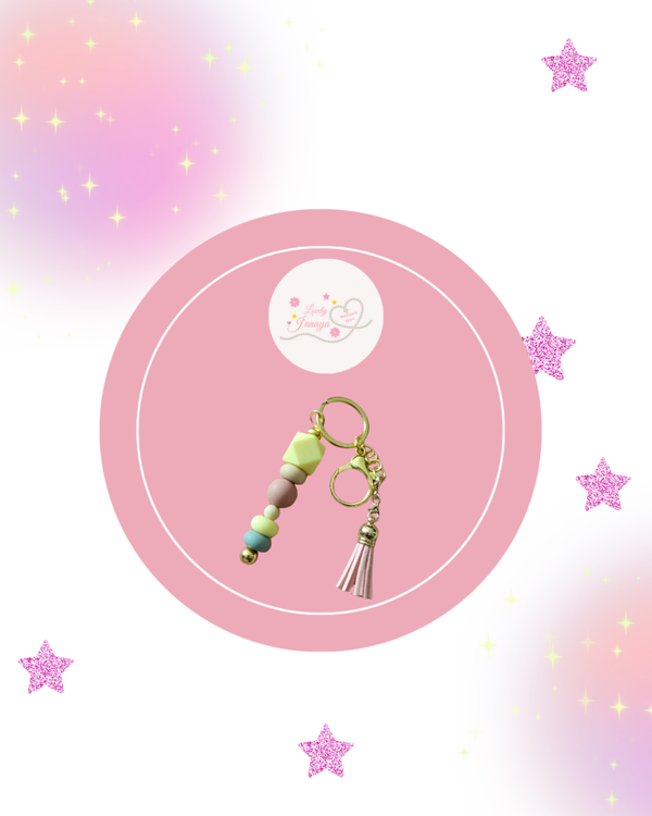 Kralen sleutelhanger met 4 kleurrijke kralen, kreeftensluiting en kwastje.
